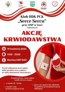 Klub HDK PCK "Serce Sercu"przy OSP w Gaci zaprasza na akcję krwiodawstwa w dniu 19.04.2026 r. Godziny rejestracji: 09:00-13:00